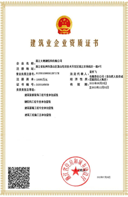 【概要描述】近期,新澳宝典下载顺利取得由省住建厅颁发的建筑工程施工总承包一级资质证书,至此,2015年12月以来使用的建筑工程施工总承包一级资质(限钢结构主体工程)证书正式宣告结束。根据2022年7月15日浙江省人民政府办公厅印发的《浙江省人民政府办公厅关于进一步支持建筑业做优做强的若干意见》,指出:“支持具有建筑工程施工总承包一级资质(限钢结构主体工程)的企业申请换发建筑工程施工总承包一级资质证书”。此次资质的取得,有效拓展了公司的业务空间,进一步提升了公司的综合实力,是公司发展史上的重要里程碑。大地钢构将立足新起点,阔步新征程,以更先进的管理理念、更稳健的经营布局、更强大的技术实力,抢抓新发展机遇,务实笃行,奋力作为,绘就大地钢构高质量发展新蓝图。
