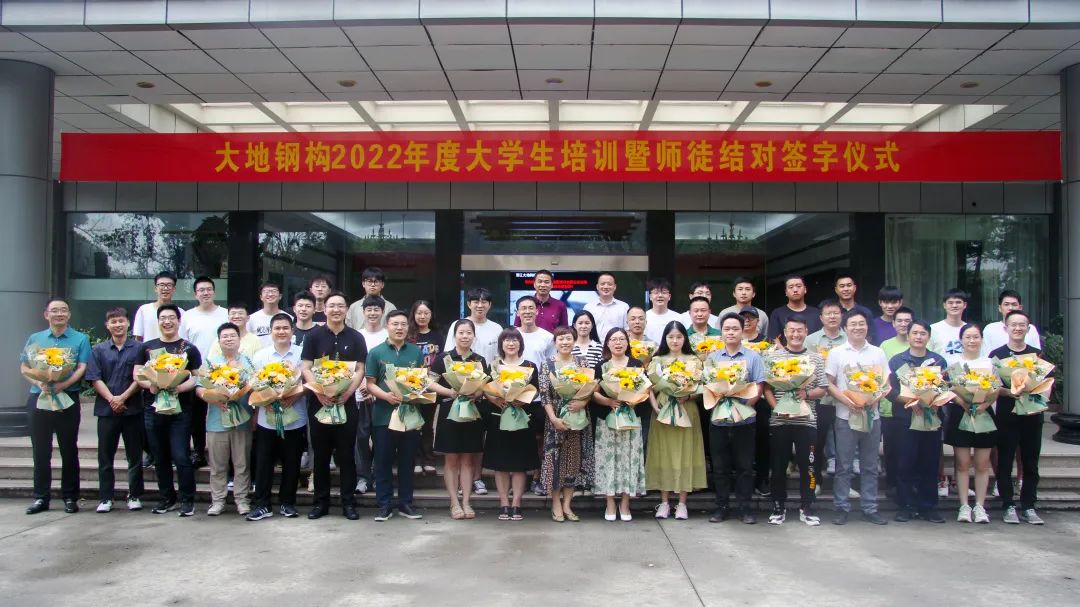 【概要描述】7月26日,大地钢构举行了2022年度大学生培训暨师徒结对签字仪式。会议采用线上+线下的方式进行,旨在增进新入职大学生的团队融入和文化认同,加强新员工对自身工作和职业生涯的认知。公司董事长裴传飞,总经理方顺生,副总经理许向军、罗明文、王春峰等中高层管理人员出席会议。