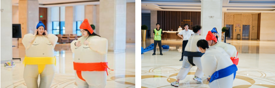 有了前两个游戏的铺垫和热身,队员们对接下来的游戏充满了好奇。“毛毛虫大作战”磨练了大家的体力和耐力,游戏过程中大家齐心协力,每一滴汗水都充满了活力。在增加彼此的熟悉度后,解锁“趣味相扑”游戏 ,参赛队员各自穿上充气相扑服进行互推,先出圈外的队员判定为失败,小伙伴们竞力角逐,不知道谁能hold到最后。“定点沙包投”游戏让大家返璞归真,感受八九十年代童年游戏的乐趣。