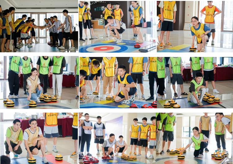 8月6日上午,“松鼠与大树”让互动升级,陆地冰壶活动将气氛推向高潮,队员手握壶柄,单膝触地,将冰壶推向赛道。随着“啪”的一声清响,对方冰壶被撞出圈外,己方得分,队友高兴地呐喊,击掌相庆。在四位队长的带领下,队员们轮流上场,依次瞄准、投壶、滑行……赛场内欢呼加油声此起彼伏。