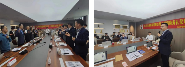 在培训过程中,参会人员分为四个小组,通过提问竞答的方式增加全员的积极性与参与感。同时还模拟了众多的商务场景,如“观察买咖啡的人”、 “礼貌结束电话争论”、“安排车位”等这些场景发人深思,让人印象深刻,进一步引发人员对实际商务工作的思考与探讨。