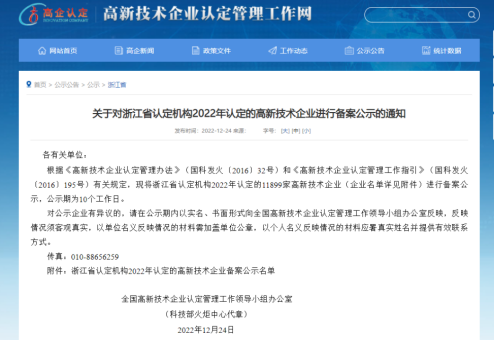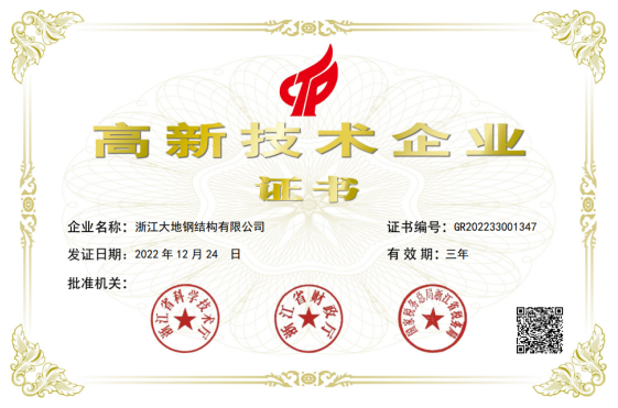 近期,全国高新技术企业认定管理工作领导小组办公室公布了浙江省认定机构2022年认定的高新技术企业备案公示名单,大地钢构再次名列其中。