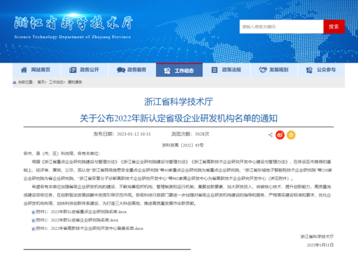 日前,浙江省科学技术厅发布了《关于公布2022年新认定省级企业研发机构名单的通知》。