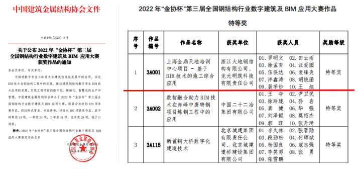 近日,2022 年“金协杯”第三届全国钢结构行业数字建筑及 BIM 应用大赛评审结果公布,由大地钢构主持申报的“上海金鼎天地培训中心项目--基于BIM技术的施工综合应用”作品斩获大赛特等奖。