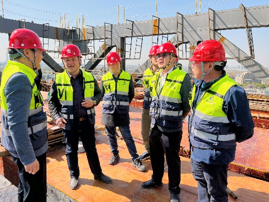 项目目前正处于顶部桁架施工的关键阶段,观摩人员深入施工现场,了解施工临时支撑措施的设置以及屋顶桁架的安装、箱型梁Q460GJD厚板的焊接实施情况。