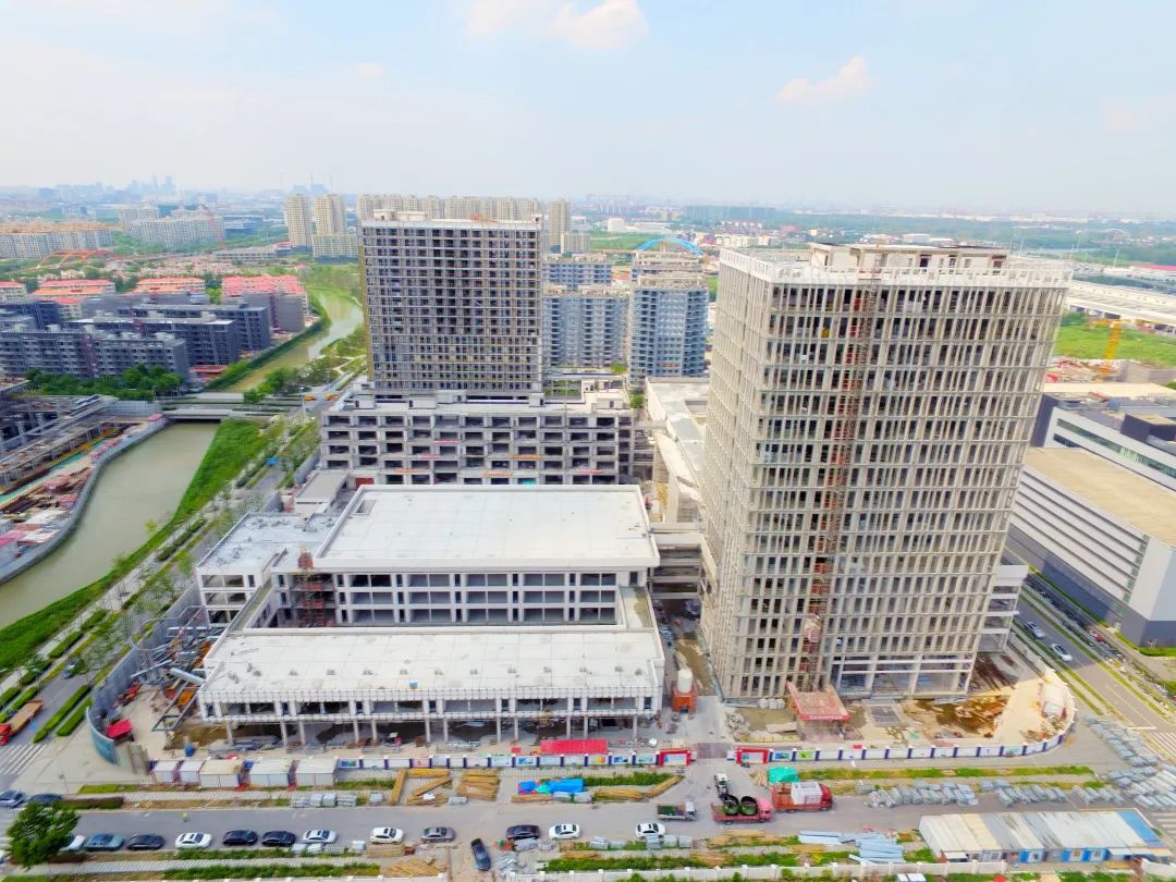 项目总建筑面积约18.17万㎡,地上由A、B、C、D四栋单体建筑组成,各单体通过钢连廊进行连接,结构最大跨度达33.3m,建筑高度79.9m。