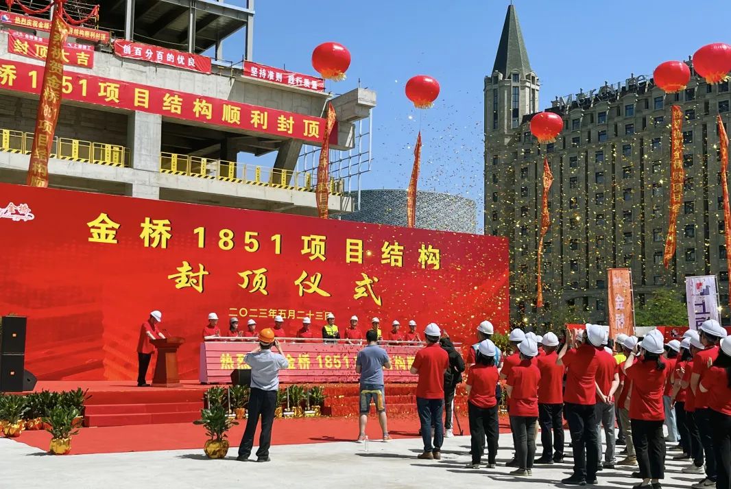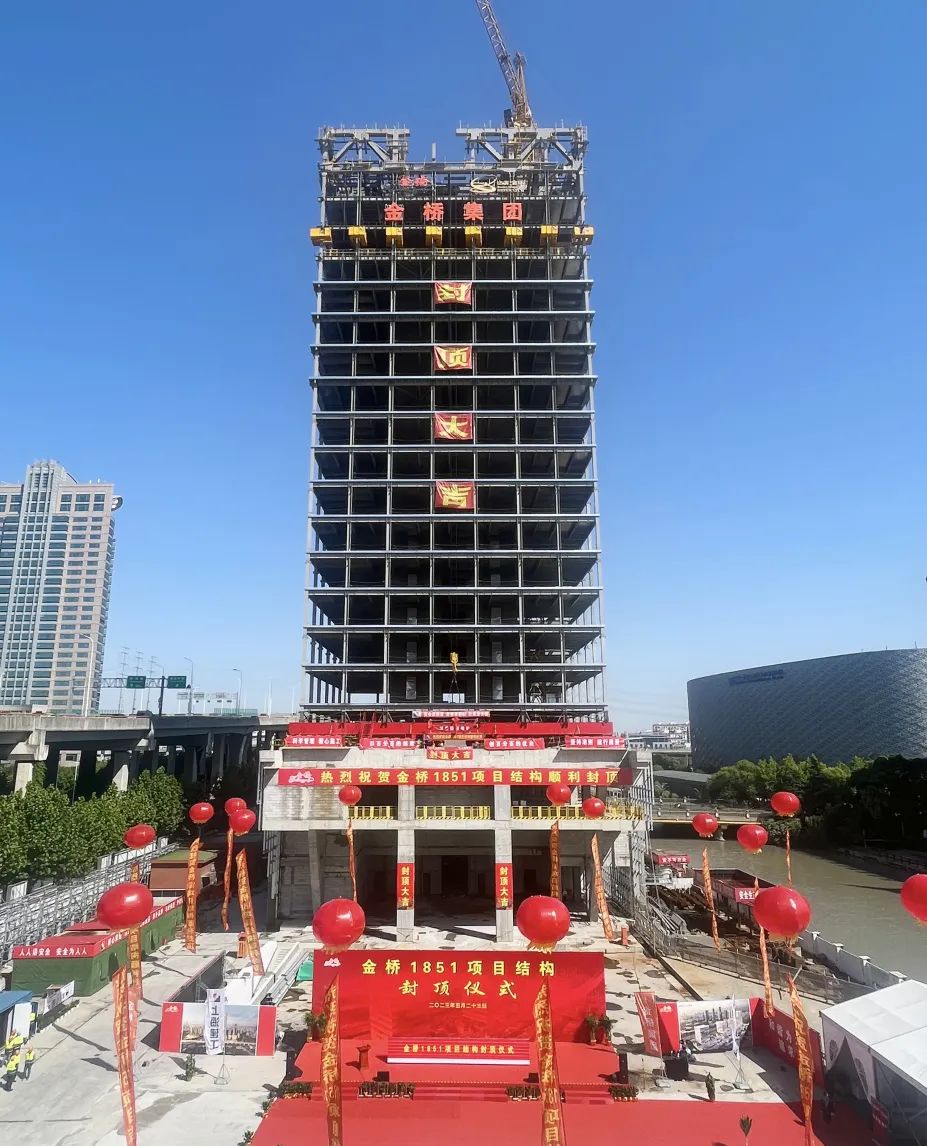 【概要描述】5月23日上午九点二十八分,上海金桥国培地块研发项目结构封顶仪式在施工现场隆重举行,浦东新区政府、金桥集团、入驻企业代表、设计单位、监理单位、总承包单位及各施工单位人员共同见证了这一时刻。随着各位领导共同启动封顶推杆装置,带着彩球与彩绸的最后一根桁架上弦杆缓缓升起,平稳就位,金桥1851项目钢结构封顶仪式圆满完成。本项目位于金桥城市副中心核心区域,是“上海金环”的门户项目,也是“金色中环”发展带重点地区。工程总用钢量达2.83万吨,总建筑面积140843.54㎡,打造1幢100米主塔楼与3幢60米次塔楼,470米的裙房飞架贯通南北,以独特的建筑形象,成为“金色中环”发展带新地标。
