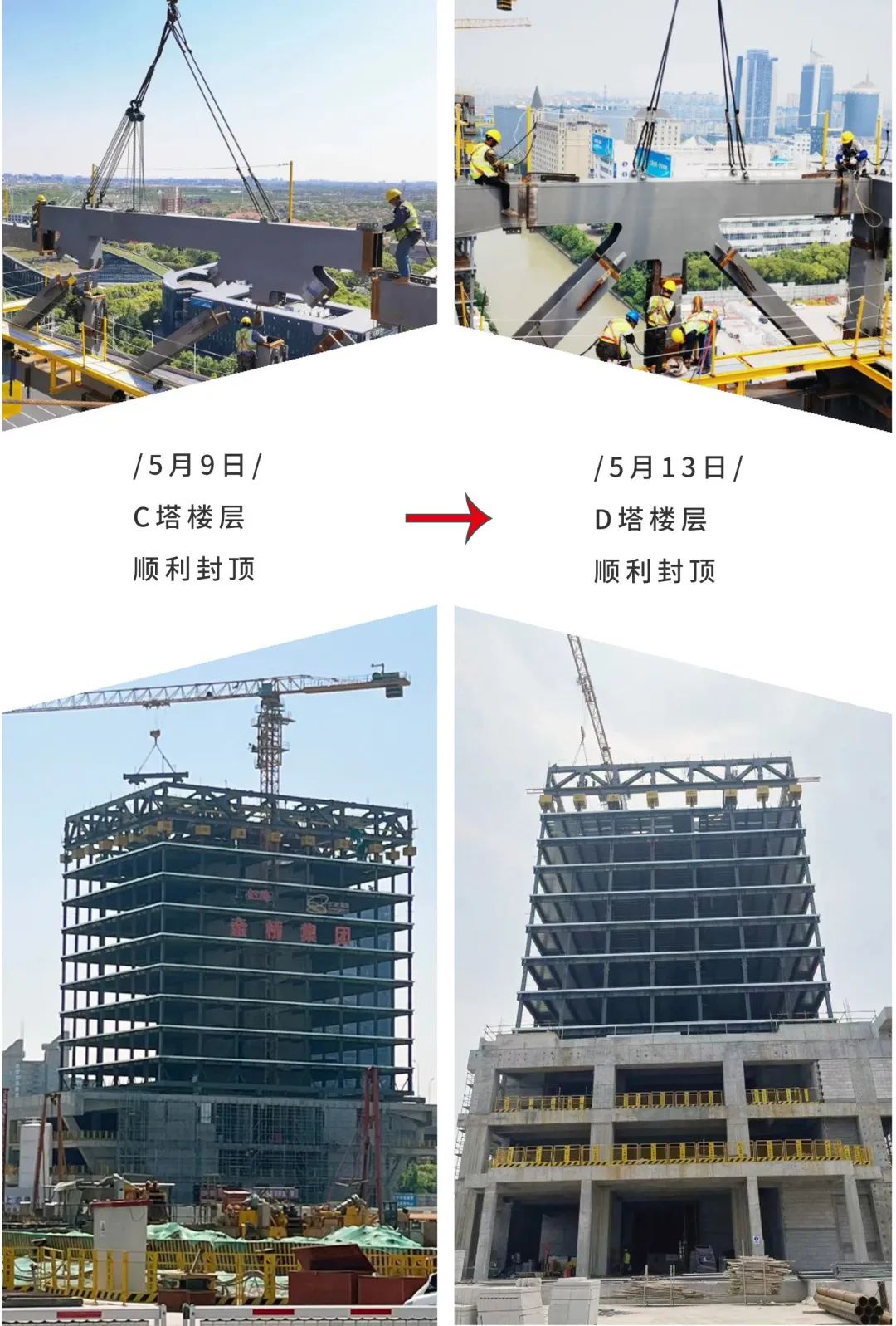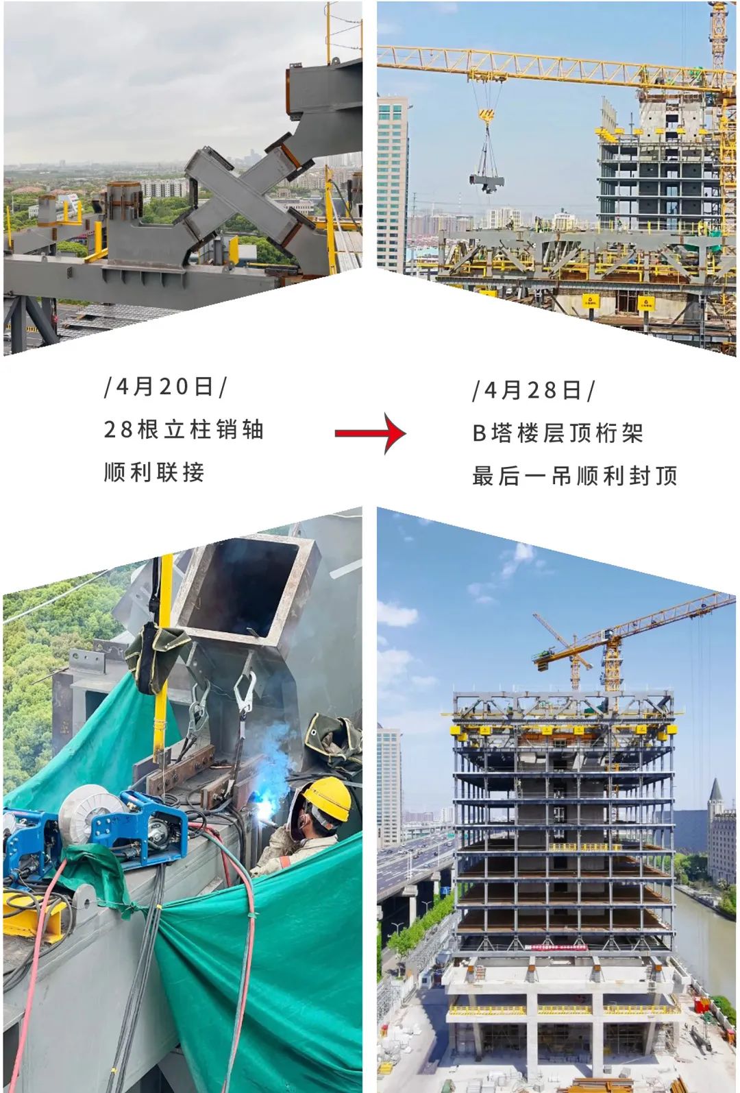 自上部结构正式施工以来,项目部精心组织,开足马力,B、C、D三幢塔楼同步施工,按照专项方案,紧盯高建钢厚板焊接以及销轴精准安装两条质量主线,多措并举,推进项目钢结构安装工作。