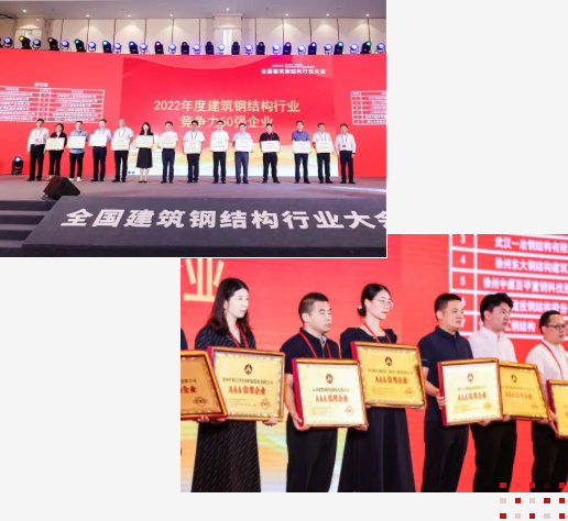 【概要描述】6月2日—4日,2023年全国建筑钢结构行业大会在上海召开。大会向第十五届“中国钢结构金奖”获奖工程单位和个人以及钢结构行业先进单位、优秀个人等进行了表彰,谋求以质量树标杆,用匠心筑精品,引领我国钢结构行业高质量发展。大地钢构获评“2021年度中国建筑钢结构行业50强企业”、“2022年度中国建筑钢结构行业50强企业”、“2021年度中国建筑钢结构诚信企业”、“第一批建筑钢结构行业AAA信用企业”等多项荣誉称号,我司王旭荣获2022年度“全国钢结构工程优秀建造师”荣誉称号。