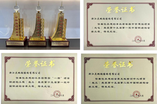 我司总承包及钢结构施工的青岛君峰路中学建设项目、江苏园博园“一期”项目钢结构工程荣获第十五届第一批“中国钢结构金奖”,金鼎天地培训中心项目荣获第十五届第二批“中国钢结构金奖”。