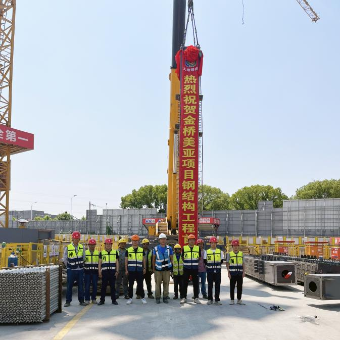 【概要描述】2023年6月10日上午十点二十八分,上海金桥美亚项目钢结构工程顺利首吊,拉开了项目主体钢结构施工序幕。金桥美亚地块项目,紧邻浦东中环线,位于金桥副中心核心区21A-01地块,是“浦东金色中环带”重要的组成部分,总建筑面积约19.2万㎡,用钢量约14000吨。地上建筑包括一栋约170米办公塔楼及裙房,两栋约100米住宅塔楼及商业裙房;地下四层,功能为商业、大堂、车库及机房等配套设施,将打造集研发办公、特色商业、高端住宅等功能为一体的复合型超高层综合体。项目团队将把钢结构首吊作为奋战新起点,精心组织、科学施工,确保安全进度质量齐抓,实现优质履约,建设精品工程,为工程建设贡献力量。