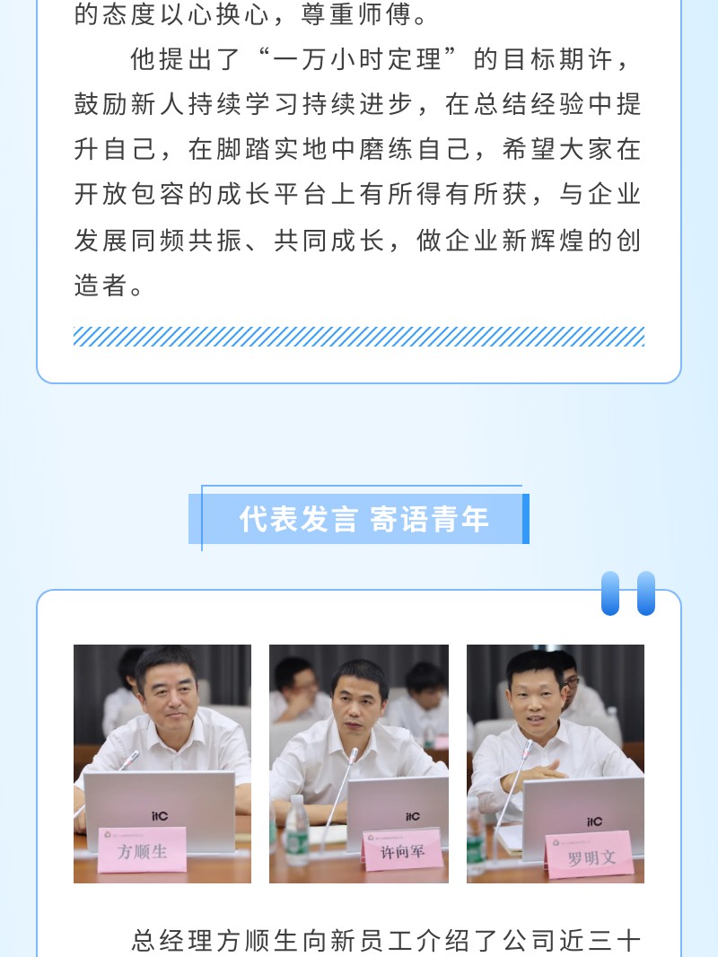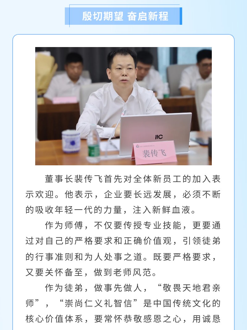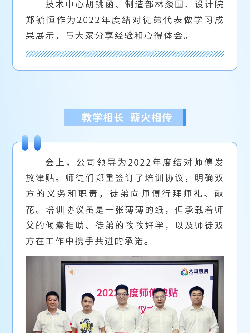 【概要描述】为帮助新员工尽快实现角色转变、适应新环境,上好新员工“职场第一课”,7月17日,大地钢构举行了2023年度大学生培训暨师徒结对签字仪式,公司董事长裴传飞,总经理方顺生,副总经理许向军、罗明文、王春峰等中高层管理人员出席会议。董事长裴传飞首先对全体新员工的加入表示欢迎。他表示,企业要长远发展,必须不断的吸收年轻一代的力量,注入新鲜血液。作为师傅,不仅要传授专业技能,更要通过对自己的严格要求和正确价值观,引领徒弟的行事准则和为人处事之道。既要严格要求,又要关怀备至,做到老师风范。作为徒弟,做事先做人,“敬畏天地君亲师”,“崇尚仁义礼智信”是中国传统文化的核心价值体系,要常怀恭敬感恩之心,用诚恳的态度以心换心,尊重师傅。他提出了“一万小时定理”的目标期许,鼓励新人持续学习持续进步,在总结经验中提升自己,在脚踏实地中磨练自己,希望大家在开放包容的成长平台上有所得有所获,与企业发展同频共振、共同成长,做企业新辉煌的创造者。
