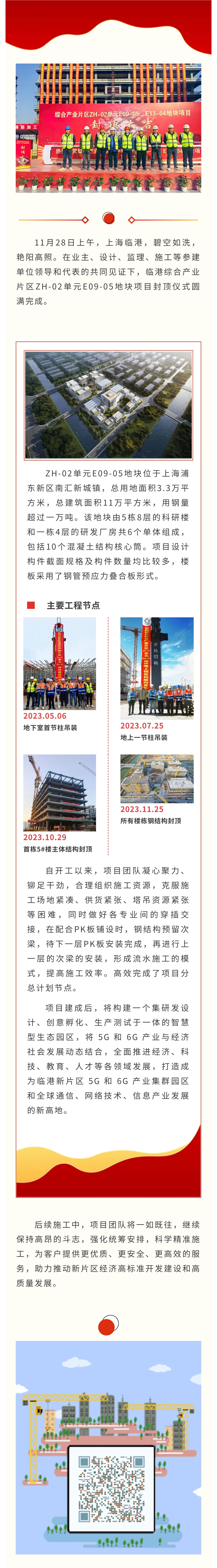 【概要描述】11月28日上午,上海临港,碧空如洗,艳阳高照。在业主、设计、监理、施工等参建单位领导和代表的共同见证下,临港综合产业片区ZH-02单元E09-05地块项目封顶仪式圆满完成。ZH-02单元E09-05地块位于上海浦东新区南汇新城镇,总用地面积3.3万平方米,总建筑面积11万平方米,用钢量超过一万吨。该地块由5栋8层的科研楼和一栋4层的研发厂房共6个单体组成,包括10个混凝土结构核心筒。项目设计构件截面规格及构件数量均比较多,楼板采用了钢管预应力叠合板形式。