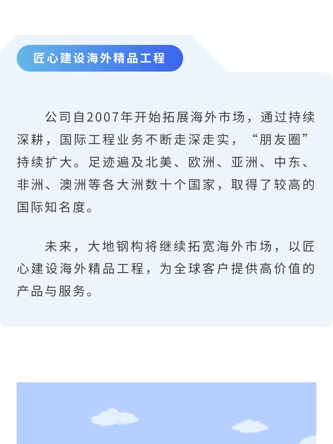 【概要描述】进入四季度以来,大地钢构聚焦生产任务,持续稳步推进项目进度,生产一线开足马力,干劲十足,为冲刺年底目标注入强劲动力。公司自2007年开始拓展海外市场,通过持续深耕,国际工程业务不断走深走实,“朋友圈”持续扩大。足迹遍及北美、欧洲、亚洲、中东、非洲、澳洲等各大洲数十个国家,取得了较高的国际知名度。未来,大地钢构将继续拓宽海外市场,以匠心建设海外精品工程,为全球客户提供高价值的产品与服务。