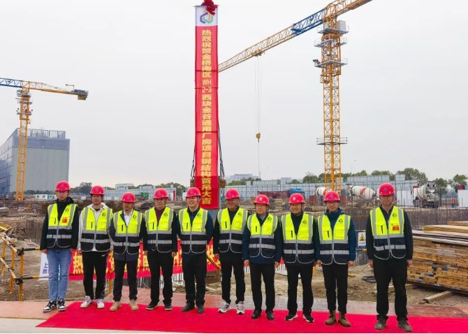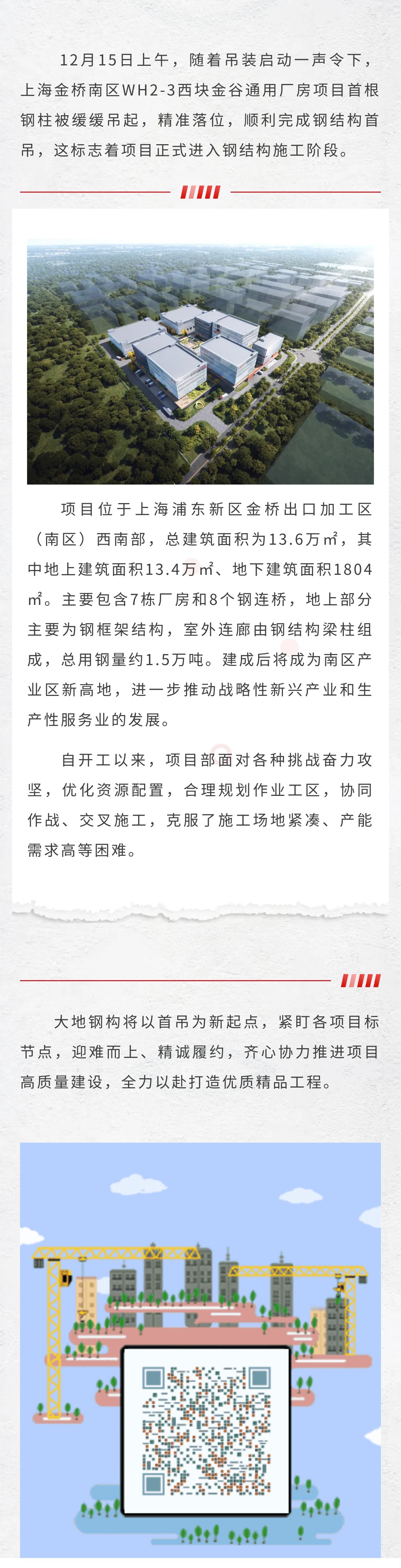 【概要描述】12月15日上午,随着吊装启动一声令下,上海金桥南区WH2-3西块金谷通用厂房项目首根钢柱被缓缓吊起,精准落位,顺利完成钢结构首吊,这标志着项目正式进入钢结构施工阶段。项目位于上海浦东新区金桥出口加工区(南区)西南部,总建筑面积为13.6万㎡,其中地上建筑面积13.4万㎡、地下建筑面积1804㎡。主要包含7栋厂房和8个钢连桥,地上部分主要为钢框架结构,室外连廊由钢结构梁柱组成,总用钢量约1.5万吨。建成后将成为南区产业区新高地,进一步推动战略性新兴产业和生产性服务业的发展。