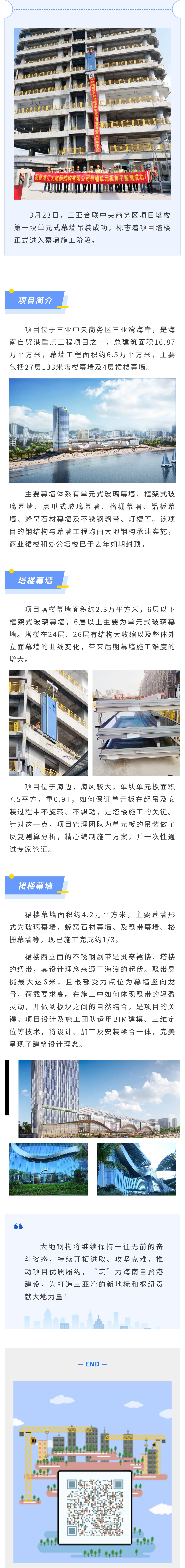 【概要描述】3月23日,三亚合联中央商务区项目塔楼第一块单元式幕墙吊装成功,标志着项目塔楼正式进入幕墙施工阶段。项目位于三亚中央商务区三亚湾海岸,是海南自贸港重点工程项目之一,总建筑面积16.87万平方米,幕墙工程面积约6.5万平方米,主要包括27层133米塔楼幕墙及4层裙楼幕墙。主要幕墙体系有单元式玻璃幕墙、框架式玻璃幕墙、点爪式玻璃幕墙、格栅幕墙、铝板幕墙、蜂窝石材幕墙及不锈钢飘带、灯槽等。该项目的钢结构与幕墙工程均由大地钢构承建实施,商业裙楼和办公塔楼已于去年如期封顶。