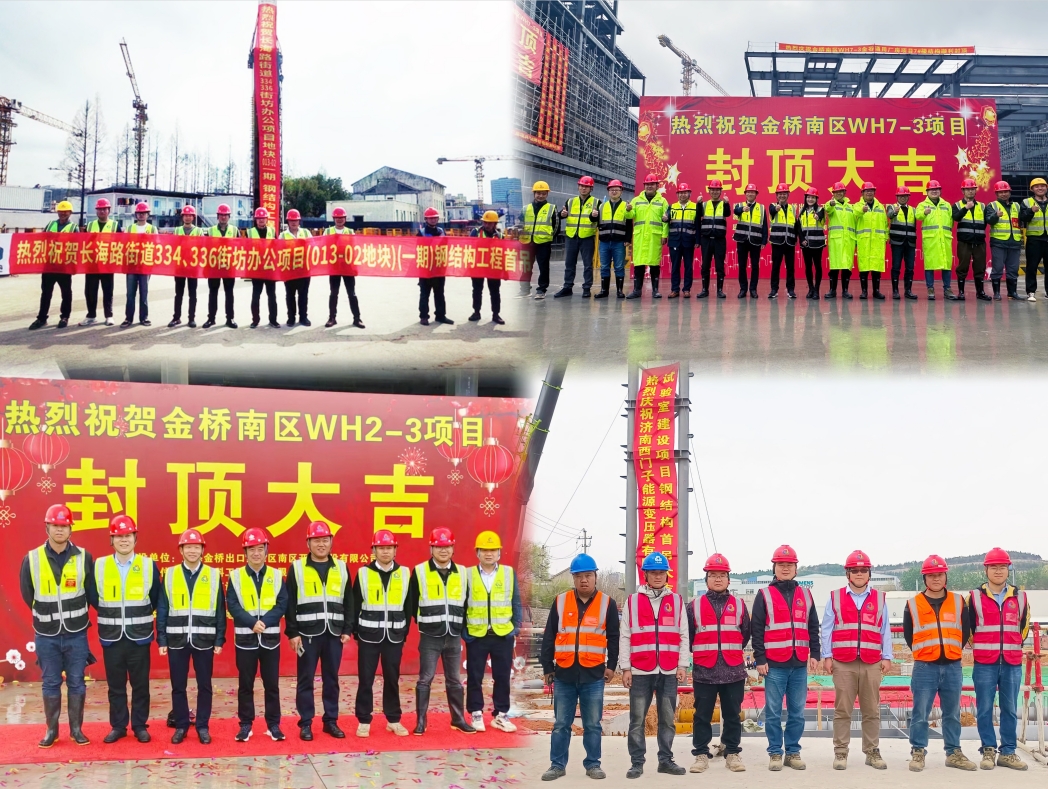 【概要描述】决胜一季度,奋战“开门红”,大地钢构鼓足拼搏劲头,朝着高质量履约目标阔步迈进,多个重点项目相继迎来关键节点。3月30日,我司承建的长海路街道334、336街坊办公楼项目013-02地块顺利完成钢结构首吊。4月8日,上海金桥南区WH7-3金谷通用厂房项目主体结构封顶仪式圆满举行。4月8日,上海金桥南区WH2-3西块金谷通用厂房项目主体结构顺利封顶。4月9日,由我司总承包建设的济南西门子能源变压器有限公司试验室项目厂房钢柱首吊取得圆满成功。这是公司继杭州西门子能源试验大厅总承包项目后,再一次承接西门子能源项目。两个新项目的顺利首吊,以及金桥南区WH7-3、WH2-3两个地块厂房的顺利封顶,是项目建设中的重要里程碑节点,为项目有序、全面的推进打下坚实基础。
