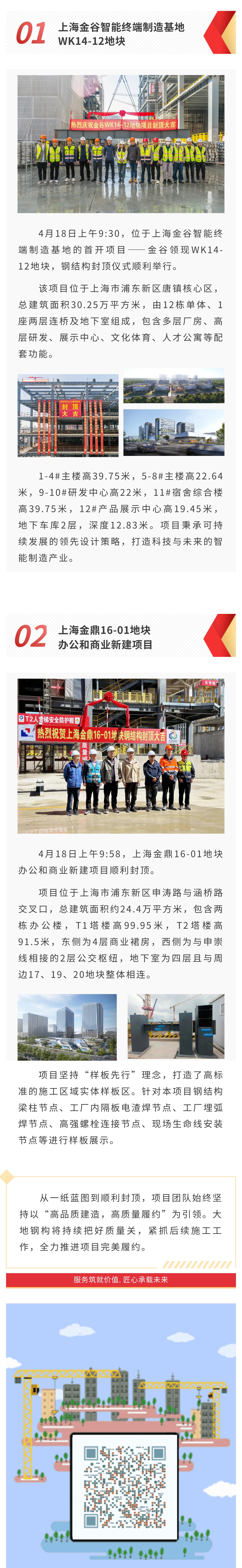 【概要描述】4月18日上午9:30,位于上海金谷智能终端制造基地的首开项目——金谷领现WK14-12地块,钢结构封顶仪式顺利举行。4月18日上午9:58,上海金鼎16-01地块办公和商业新建项目顺利封顶。从一纸蓝图到顺利封顶,项目团队始终坚持以“高品质建造,高质量履约”为引领。大地钢构将持续把好质量关,紧抓后续施工工作,全力推进项目完美履约。