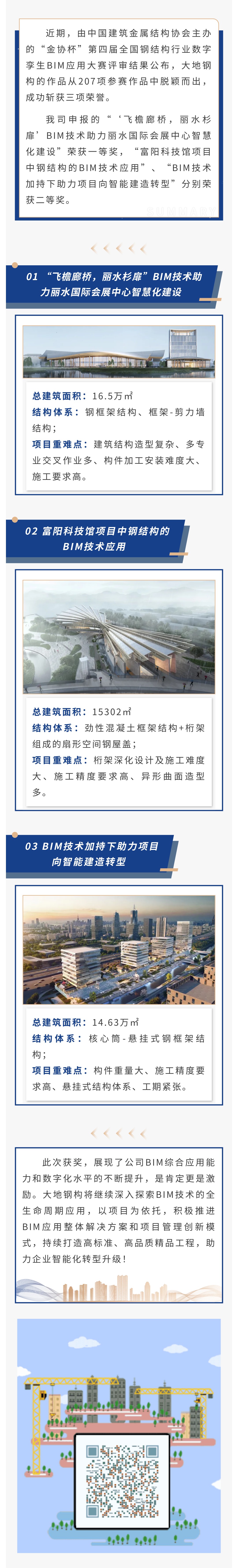 【概要描述】近期,由中国建筑金属结构协会主办的“金协杯”第四届全国钢结构行业数字孪生BIM应用大赛评审结果公布,大地钢构的作品从207项参赛作品中脱颖而出,成功斩获三项荣誉。我司申报的“‘飞檐廊桥,丽水杉扉’BIM技术助力丽水国际会展中心智慧化建设”荣获一等奖,“富阳科技馆项目中钢结构的BIM技术应用”、“BIM技术加持下助力项目向智能建造转型”分别荣获二等奖。