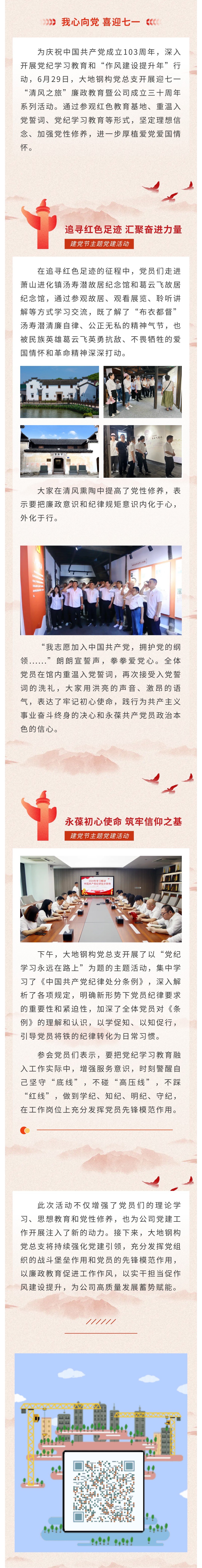 【概要描述】为庆祝中国共产党成立103周年,深入开展党纪学习教育和“作风建设提升年”行动,6月29日,大地钢构党总支开展迎七一“清风之旅”廉政教育暨公司成立三十周年系列活动。通过参观红色教育基地、重温入党誓词、党纪学习教育等形式,坚定理想信念、加强党性修养,进一步厚植爱党爱国情怀。此次活动不仅增强了党员们的理论学习、思想教育和党性修养,也为公司党建工作开展注入了新的动力。接下来,大地钢构党总支将持续强化党建引领,充分发挥党组织的战斗堡垒作用和党员的先锋模范作用,以廉政教育促进工作作风,以实干担当促作风建设提升,为公司高质量发展蓄势赋能。