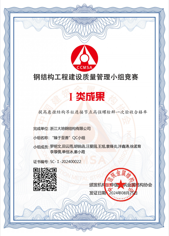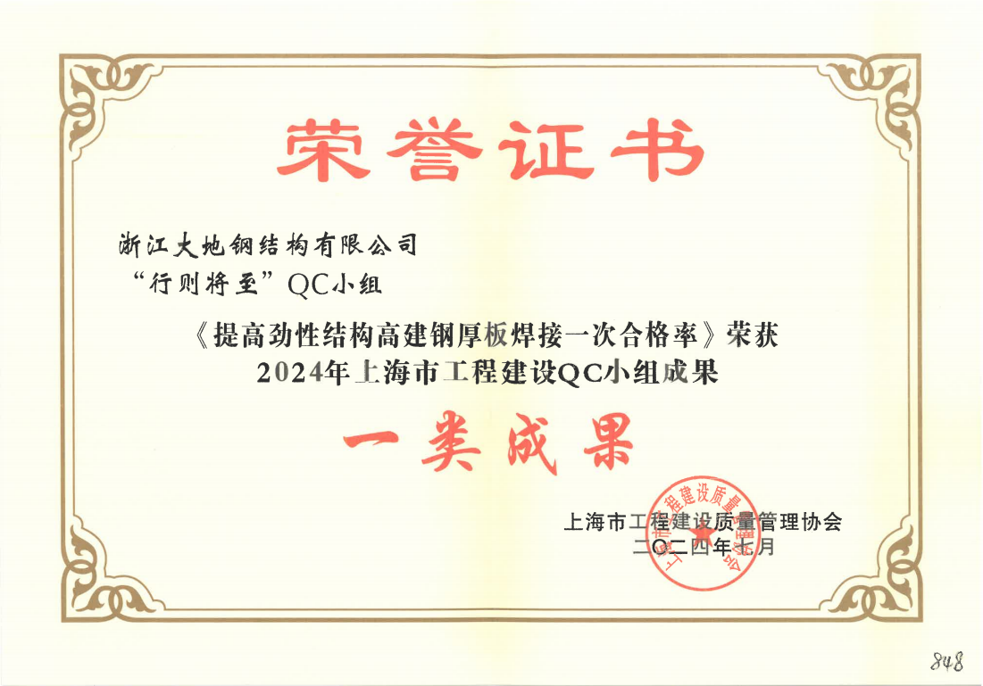 近日,中国建筑金属结构协会、上海市工程建设质量管理协会相继公布了2024年工程建设质量管理小组成果大赛获奖名单。公司申报的两项QC成果《提高悬挂结构吊柱连接节点高强螺栓群一次验收合格率》和《提高劲性结构高建钢厚板焊接一次合格率》分别获得2024年全国钢结构工程建设质量管理小组竞赛I类成果、上海市工程建设QC小组一类成果。