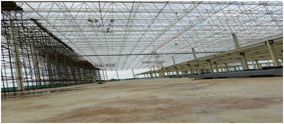 自2016年11月份开始网架安装,项目部充分考虑现场土建单位施工平台逐步移交及当地物资缺乏的现实因素,果断采用了滑移脚手架的施工方案,既经济又合理,保证了施工质量及安全,满足了项目工期要求,得到了总包和业主单位的一致认可。