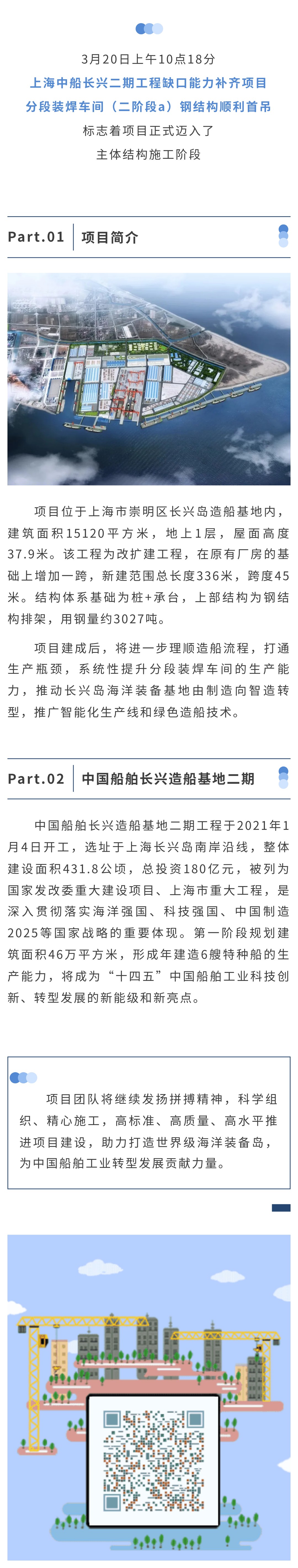 【概要描述】3月20日上午10点18分,上海中船长兴二期工程缺口能力补齐项目分段装焊车间(二阶段a)钢结构顺利首吊,标志着项目正式迈入了主体结构施工阶段。项目位于上海市崇明区长兴岛造船基地内,建筑面积15120平方米,地上1层,屋面高度37.9米。该工程为改扩建工程,在原有厂房的基础上增加一跨,新建范围总长度336米,跨度45米。结构体系基础为桩+承台,上部结构为钢结构排架,用钢量约3027吨。项目建成后,将进一步理顺造船流程,打通生产瓶颈,系统性提升分段装焊车间的生产能力,推动长兴岛海洋装备基地由制造向智造转型,推广智能化生产线和绿色造船技术。