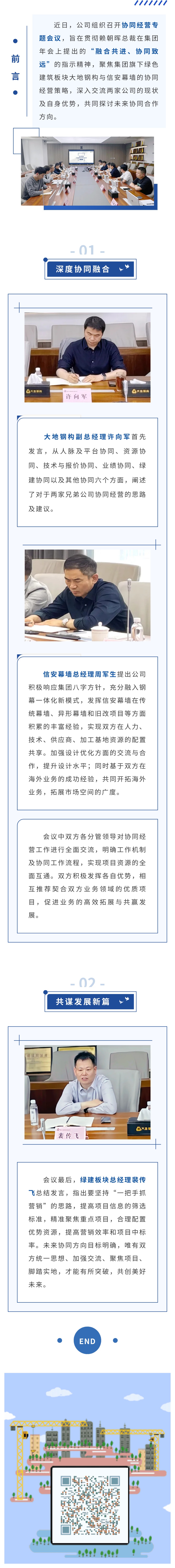 【概要描述】近日,公司组织召开协同经营专题会议,旨在贯彻赖朝晖总裁在集团年会上提出的“融合共进、协同致远”的指示精神,聚焦集团旗下绿色建筑板块大地钢构与信安幕墙的协同经营策略,深入交流两家公司的现状及自身优势,共同探讨未来协同合作方向。 会议最后,绿建板块总经理裴传飞总结发言,指出要坚持“一把手抓营销”的思路,提高项目信息的筛选标准,精准聚焦重点项目,合理配置优势资源,提高营销效率和项目中标率。未来协同方向目标明确,唯有双方统一思想、加强交流、聚焦项目、脚踏实地,才能有所突破,共创美好未来。