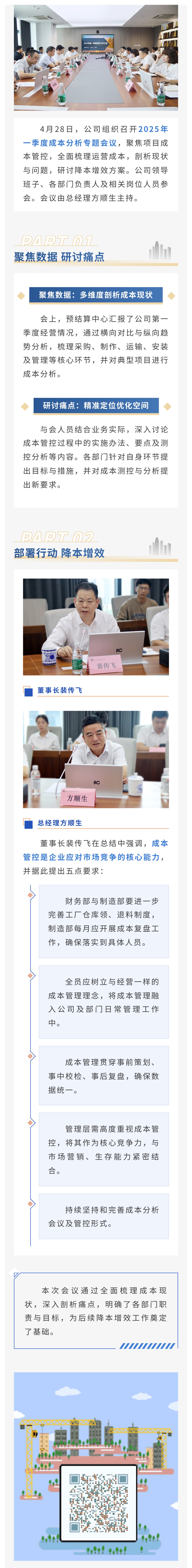 【概要描述】4月28日,公司组织召开2025年一季度成本分析专题会议,聚焦项目成本管控,全面梳理运营成本,剖析现状与问题,研讨降本增效方案。会议由公司领导班子、各部门负责人及相关岗位人员参会。会议由总经理方顺生主持。本次会议通过全面梳理成本现状,深入剖析痛点,明确了各部门职责与目标,为后续降本增效工作奠定了基础。
