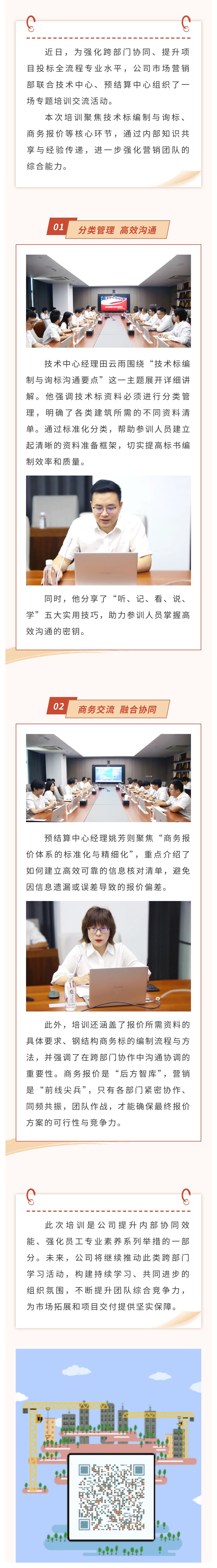 【概要描述】近日,为强化跨部门协同、提升项目投标全流程专业水平,公司市场营销部联合技术中心、预结算中心组织了一场专题培训交流活动。本次培训聚焦技术标编制与询标、商务报价等核心环节,通过内部知识共享与经验传递,进一步强化营销团队的综合能力。此次培训是公司提升内部协同效能、强化员工专业素养系列举措的一部分。未来,公司将继续推动此类跨部门学习活动,构建持续学习、共同进步的组织氛围,不断提升团队综合竞争力,为市场拓展和项目交付提供坚实保障。