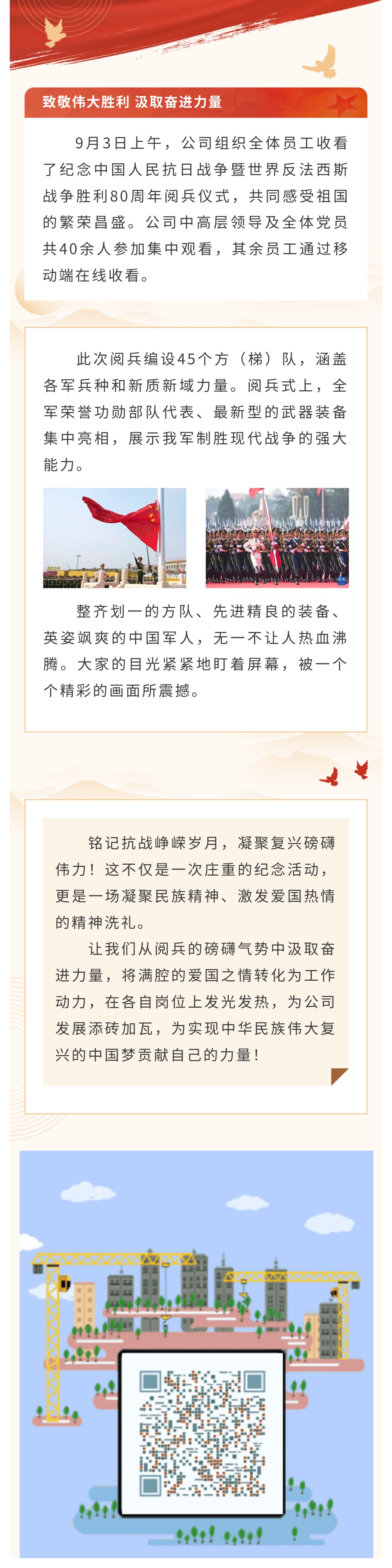 9月3日上午,公司组织全体员工收看了纪念中国人民抗日战争暨世界反法西斯战争胜利80周年阅兵仪式,共同感受祖国的繁荣昌盛。公司中高层领导及全体党员共40余人参加集中观看,其余员工通过移动端在线收看。铭记抗战峥嵘岁月,凝聚复兴磅礴伟力!这不仅是一次庄重的纪念活动,更是一场凝聚民族精神、激发爱国热情的精神洗礼。让我们从阅兵的磅礴气势中汲取奋进力量,将满腔的爱国之情转化为工作动力,在各自岗位上发光发热,为公司发展添砖加瓦,为实现中华民族伟大复兴的中国梦贡献自己的力量!