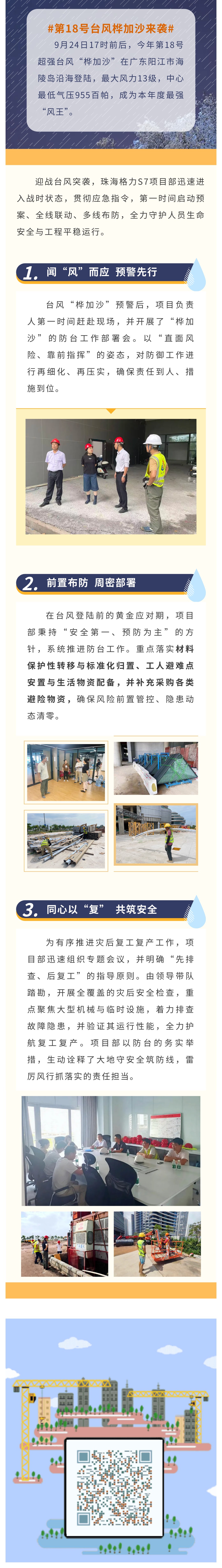 【概要描述】9月24日17时前后,今年第18号超强台风“桦加沙”在广东阳江市海陵岛沿海登陆,最大风力13级,中心最低气压955百帕,成为本年度最强“风王”。迎战台风突袭,珠海格力S7项目部迅速进入战时状态,贯彻应急指令,第一时间启动预案、全线联动、多线布防,全力守护人员生命安全与工程平稳运行。
