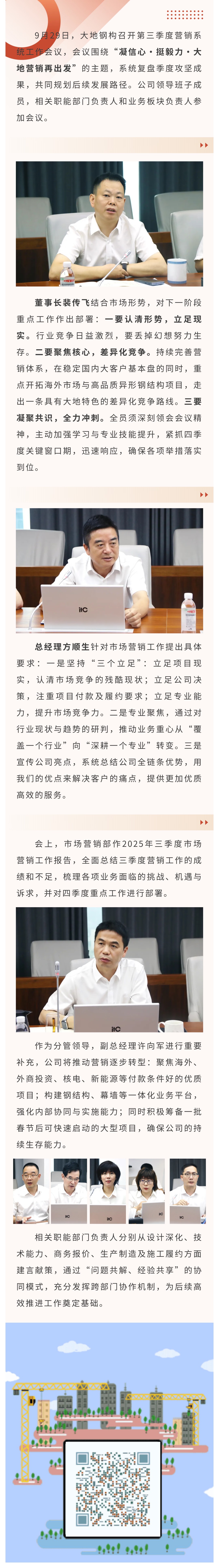 【概要描述】9月29日,大地钢构召开第三季度营销系统工作会议,会议围绕“凝信心·挺毅力·大地营销再出发”的主题,系统复盘季度攻坚成果,共同规划后续发展路径。公司领导班子成员,相关职能部门负责人和业务板块负责人参加会议。
