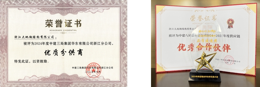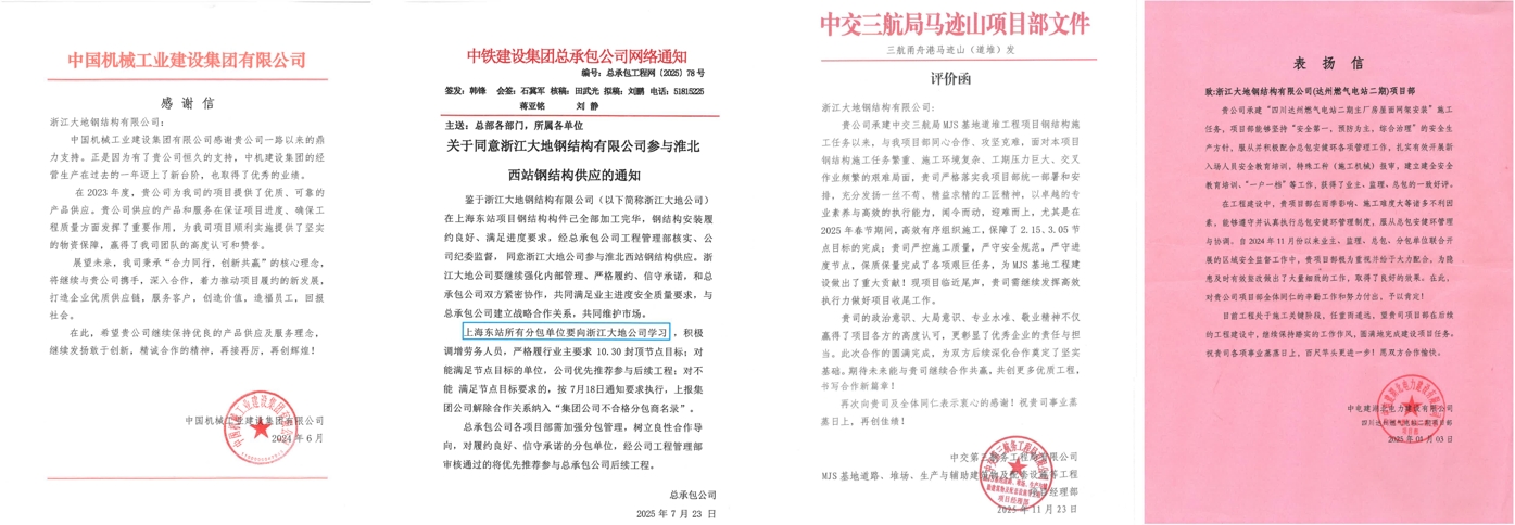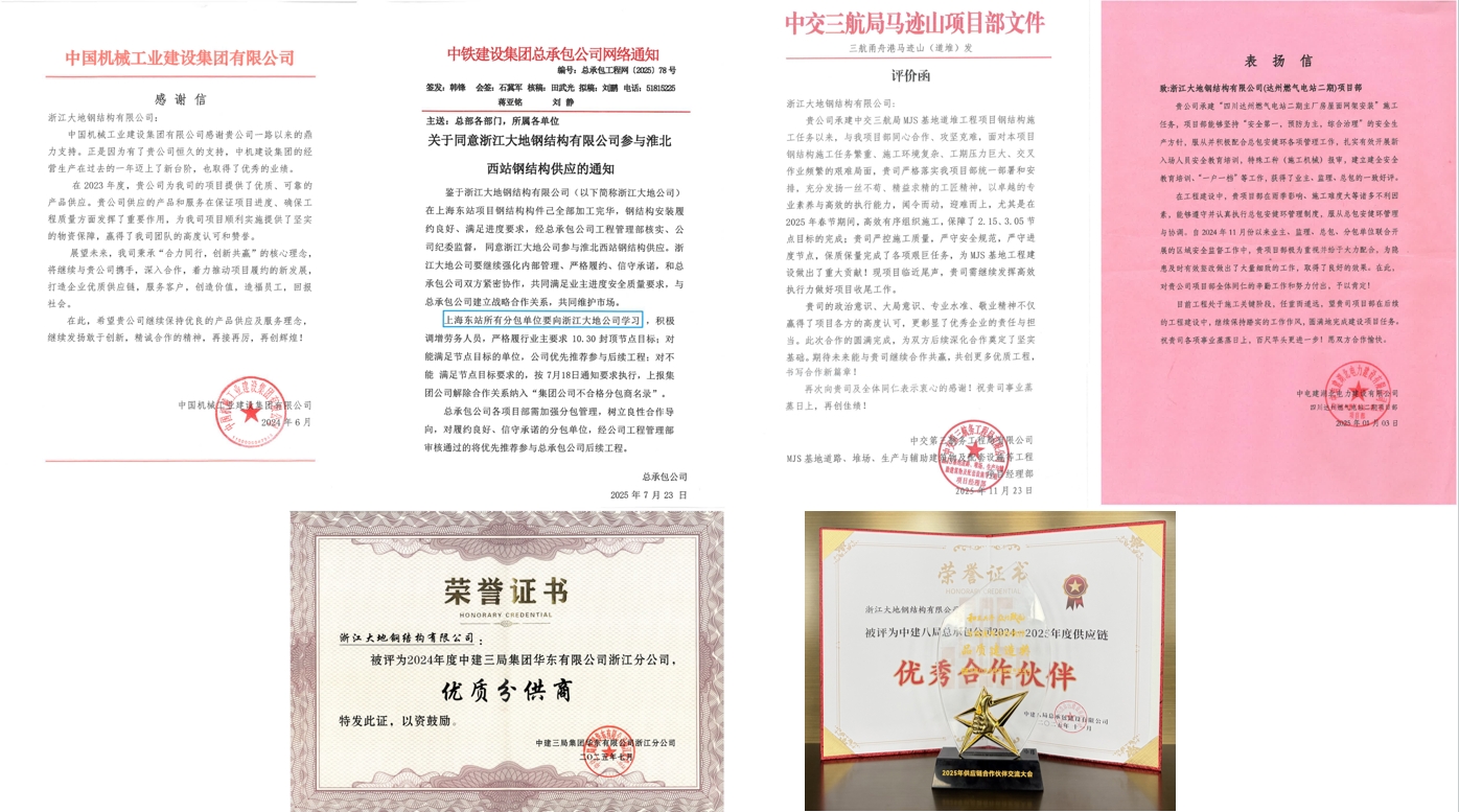 三十多载深耕不辍,初心如磐。每一份来自客户的认可与嘉奖,都彰显了公司的专业能力和服务理念,这些荣誉共同铸就了大地钢构的市场信誉品牌。