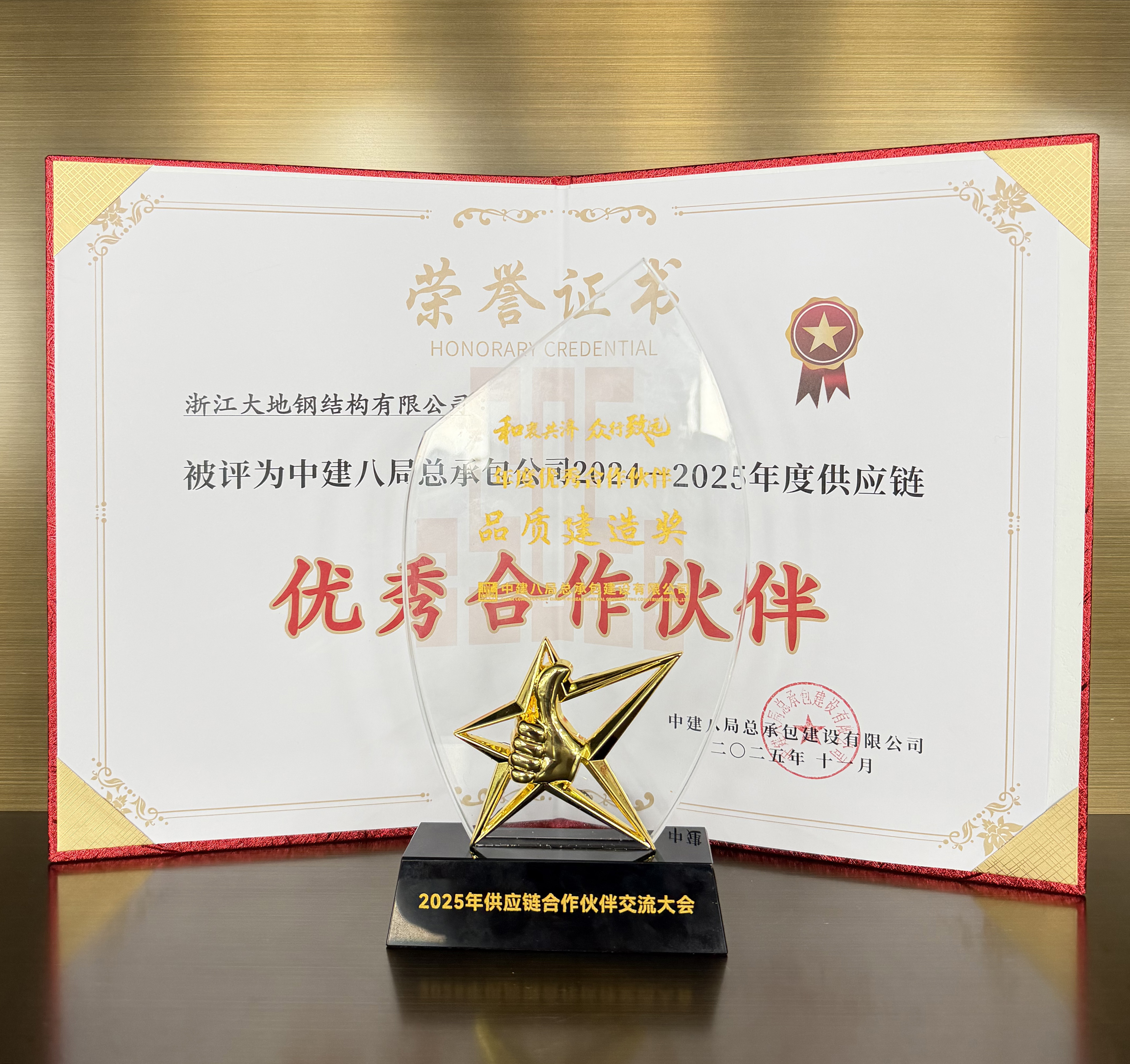 近日,中建八局总承包公司2025年供应链合作伙伴交流大会在上海顺利召开。大地钢构凭借卓越的履约能力、专业的技术实力与始终如一的可靠品质,荣获“优秀合作伙伴”称号。