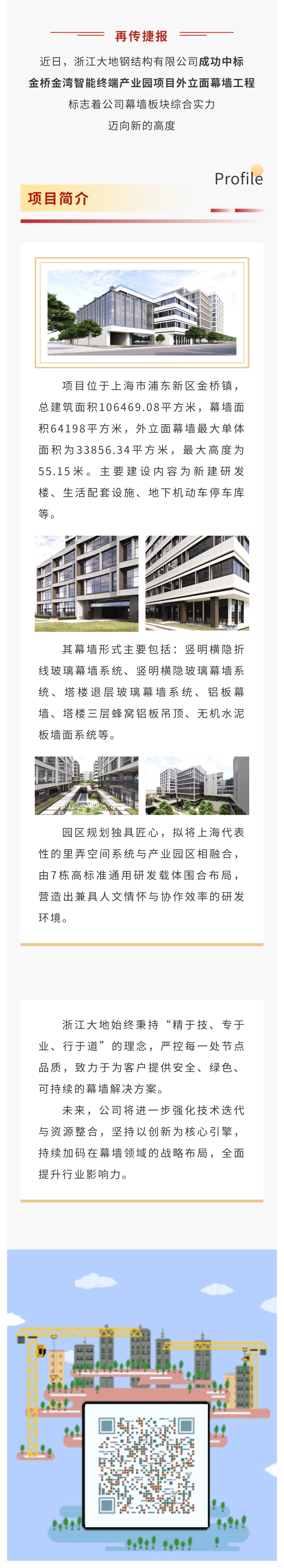 【概要描述】近日,新澳宝典下载成功中标金桥金湾智能终端产业园项目外立面幕墙工程,标志着公司幕墙板块综合实力迈向新的高度。项目位于上海市浦东新区金桥镇,总建筑面积106469.08平方米,幕墙面积64198平方米,外立面幕墙最大单体面积为33856.34平方米,最大高度为55.15米。主要建设内容为新建研发楼、生活配套设施、地下机动车停车库等。其幕墙形式主要包括:竖明横隐折线玻璃幕墙系统、竖明横隐玻璃幕墙系统、塔楼退层玻璃幕墙系统、铝板幕墙、塔楼三层蜂窝铝板吊顶、无机水泥板墙面系统等。园区规划独具匠心,拟将上海代表性的里弄空间系统与产业园区相融合,由7栋高标准通用研发载体围合布局,营造出兼具人文情怀与协作效率的研发环境。浙江大地始终秉持“精于技、专于业、行于道”的理念,严控每一处节点品质,致力于为客户提供安全、绿色、可持续的幕墙解决方案。未来,公司将进一步强化技术迭代与资源整合,坚持以创新为核心引擎,持续加码在幕墙领域的战略布局,全面提升行业影响力。