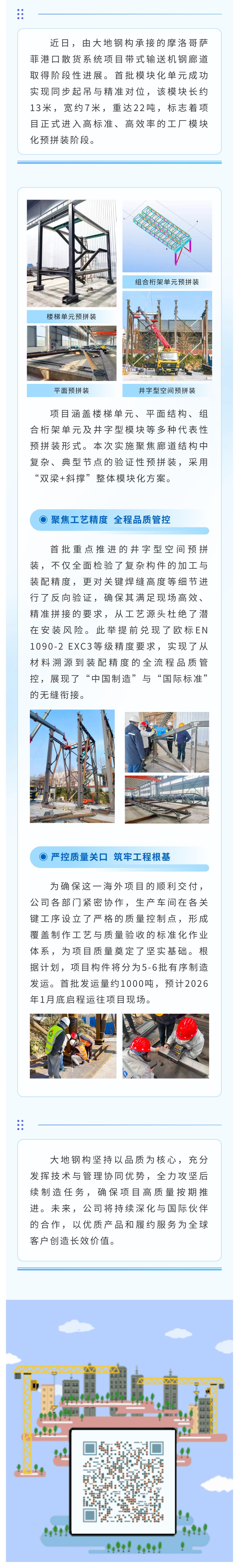 【概要描述】近日,由大地钢构承接的摩洛哥萨菲港口散货系统项目带式输送机钢廊道取得阶段性进展。首批模块化单元成功实现同步起吊与精准对位,该模块长约13米,宽约7米,重达22吨,标志着项目正式进入高标准、高效率的工厂模块化预拼装阶段。项目涵盖楼梯单元、平面结构、组合桁架单元及井字型模块等多种代表性预拼装形式。本次实施聚焦廊道结构中复杂、典型节点的验证性预拼装,采用“双梁+斜撑”整体模块化方案。首批重点推进的井字型空间预拼装,不仅全面检验了复杂构件的加工与装配精度,更对关键焊缝高度等细节进行了反向验证,确保其满足现场高效、精准拼接的要求,从工艺源头杜绝了潜在安装风险。此举提前兑现了欧标EN 1090-2 EXC3等级精度要求,实现了从材料溯源到装配精度的全流程品质管控,展现了“中国制造”与“国际标准”的无缝衔接。为确保这一海外项目的顺利交付,公司各部门紧密协作,生产车间在各关键工序设立了严格的质量控制点,形成覆盖制作工艺与质量验收的标准化作业体系,为项目质量奠定了坚实基础。根据计划,项目构件将分为5-6批有序制造发运。首批发运量约1000吨,预计2026年1月底启程运往项目现场。大地钢构坚持以品质为核心,充分发挥技术与管理协同优势,全力攻坚后续制造任务,确保项目高质量按期推进。未来,公司将持续深化与国际伙伴的合作,以优质产品和履约服务为全球客户创造长效价值。