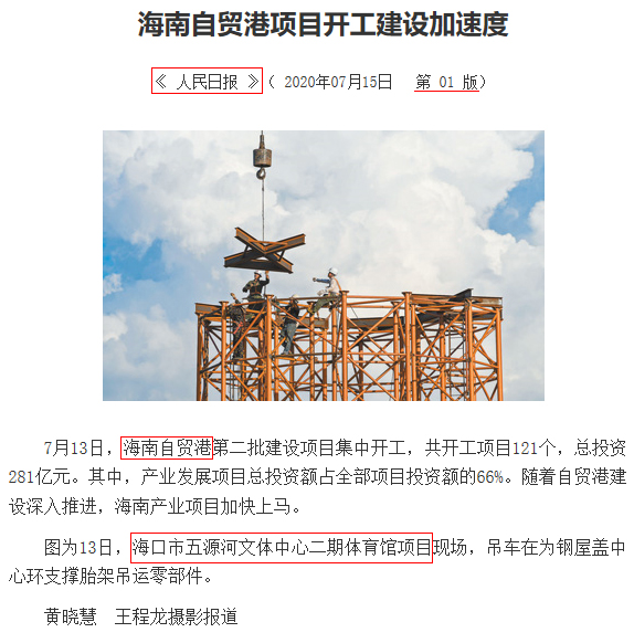 由龙元集团新澳宝典下载承接的海口五源河文体中心二期体育馆项目被人民日报关注,刊登于7月15日《人民日报》头版。