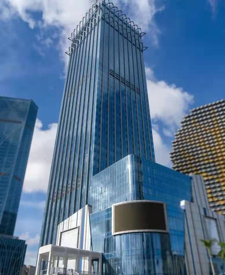 珠海横琴大厦项目位于珠海市横琴新区口岸服务区,是一座集商业、办公等多种类型的超高层建筑,总建筑面积约12.5万㎡。工程主体采用钢结构,结构形式包括:箱型柱、双 H 型钢柱、五边形柱、十字柱、箱型钢板墙、H 型钢梁及箱型梁,H 型钢支撑等,类型多样,制作及施工控制要求很高。建筑外围护采用玻璃幕墙,采用全装修,工程采用装配式建造设计及施工方式。主体地下 4 层,地上 44 层,标高为 199.62 m,裙房 10 层, 标高为 50.7 m。裙房与塔楼连为一体。标准层层高为 4.4m。塔楼平面典型尺 寸为 42.5X42.5m。高宽比约为 4.43。总建筑面积约 12.5 万 m² 。本工程主体采用钢结构,主楼50.7m以下钢柱、钢板墙及其肋板、连接板采用Q345GJB钢,其他钢柱、钢梁、钢板墙支撑及其肋板、连接板采用Q345B钢,锚栓采用Q345钢,隅撑采用Q235B钢,对于板厚≥40mm的钢板,要求其达到Z15要求。采用厚板,在制作和施工安装难度都很大。