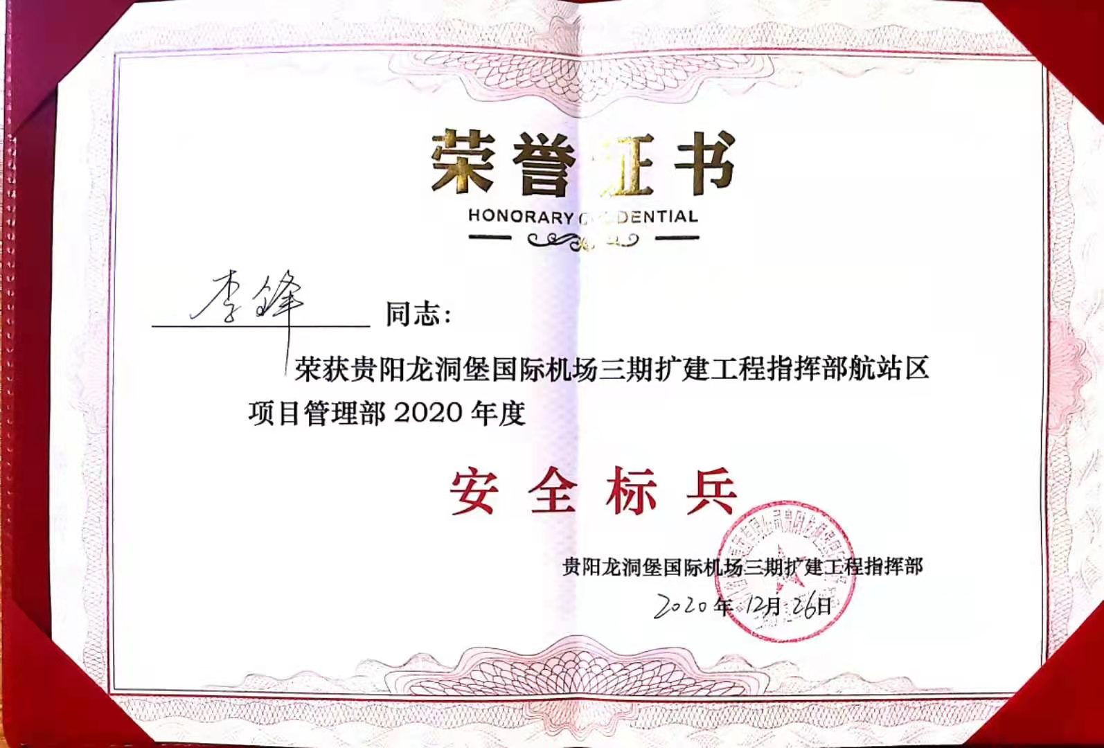 近期,在对我司项目施工进度、施工质量、安全保障等现场考察、观摩后,贵阳机场三期扩建指挥部为我司颁发了贵阳机场项目管理部“2020年度先进单位”的荣誉证书,李锋同志也荣获“2020年度安全标兵”的称号。