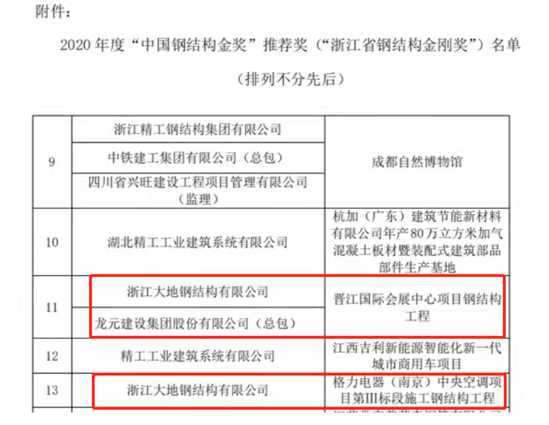 2021年1月,浙江省钢结构行业协会公布了2020年度“中国钢结构金奖”推荐奖(“浙江省钢结构金刚奖”)评选结果名单,经协会预审、专家组现场检查和技术资料核查、评委会评审等阶段,由我司承建的“晋江国际会展中心项目钢结构工程”和“格力电器(南京)中央空调项目第Ⅲ标段施工钢结构工程”两大项目荣获该项称号。
