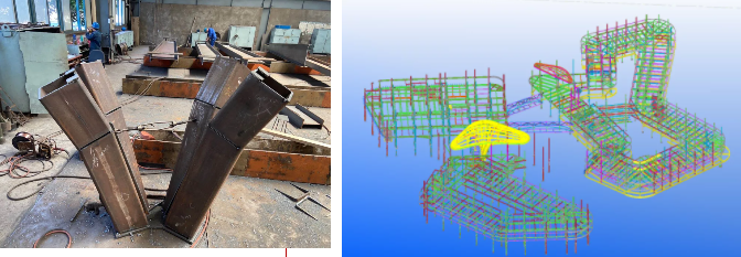 项目运用BIM技术对结构进行三维建模放样,实现曲面造型及参数化控制,以三维模型为提取坐标点数据,指导钢结构装配胎架的搭设,保证了构件加工精度。采用三维模型模拟施工流程,优化施工工序,辅助进行施工技术交底,让作业人员高效准确的理解复杂结构节点。