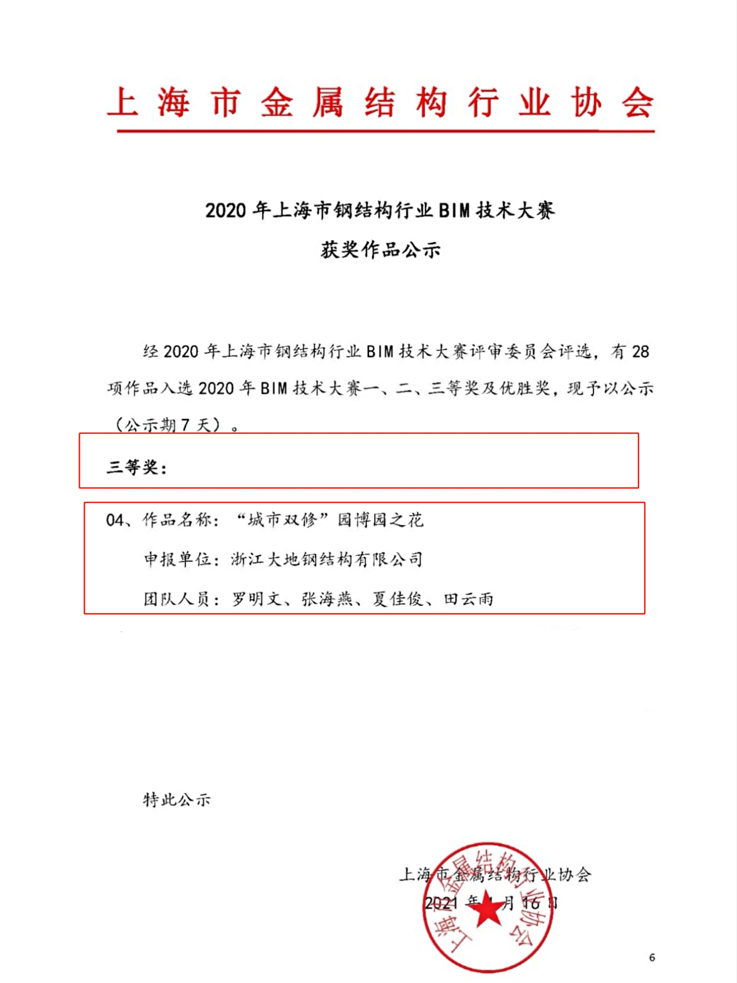 赞!大地钢构荣获2020年上海市钢结构行业BIM技术大赛三等奖
