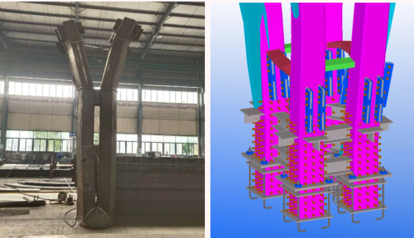 本项目重难点在于屋面钢结构与木结构的结合,以及屋顶两处开花柱和上部花冠钢结构与膜结构的配合,由于钢结构屋面和开花柱、花冠是空间双曲造型,对于深化建模出图、车间加工、构件运输、现场高空安装等工作的要求较高。