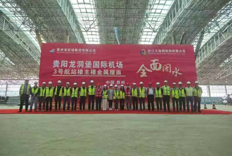3月30日,贵阳龙洞堡国际机场三号航站楼主体屋面工程在全体参建人员的努力拼搏下实现全面闭水,如期完成闭水节点。三期扩建指挥部班子领导及各部门代表、大地钢构领导等人共同参与了闭水仪式。