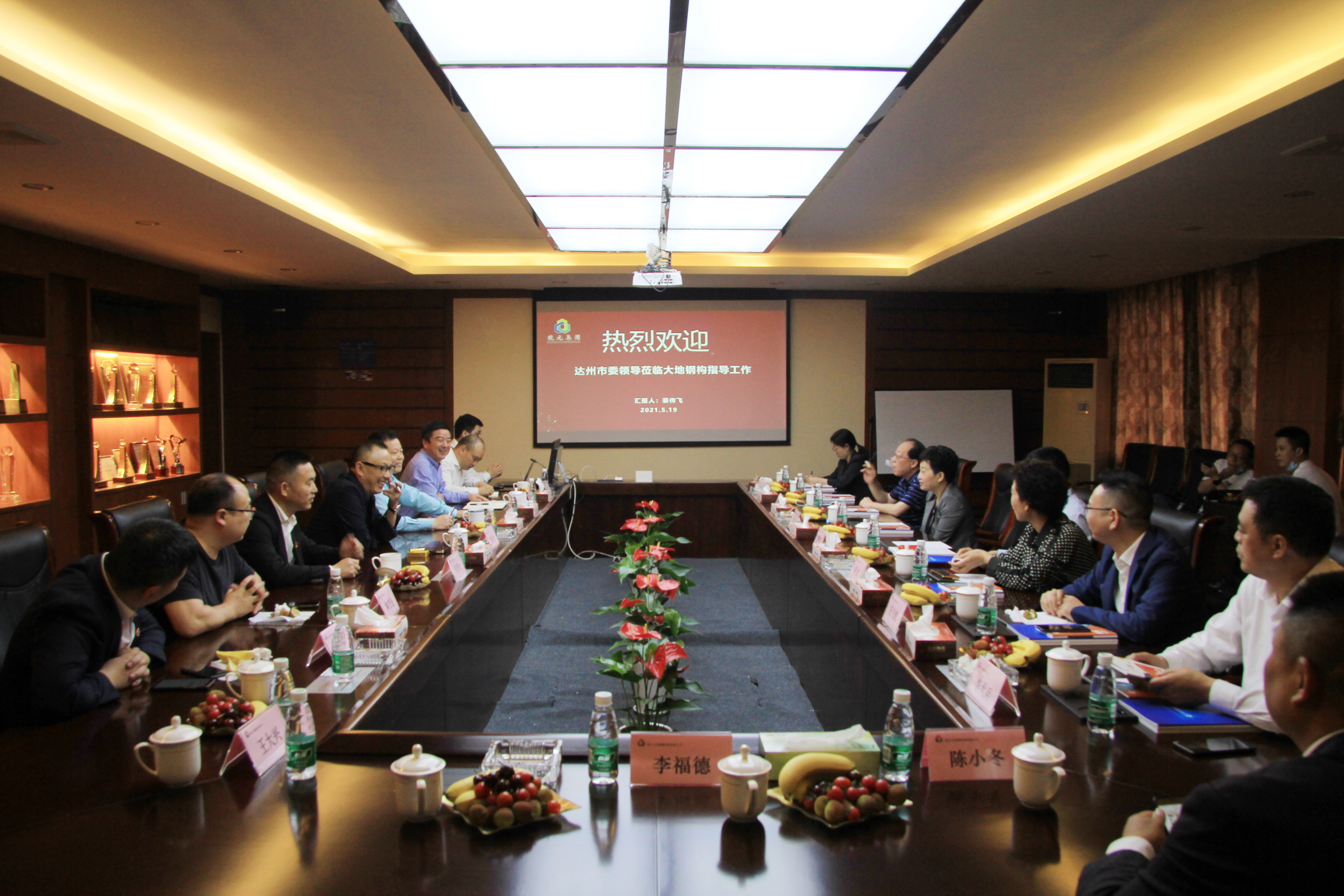 5月19日上午,达州市委副书记、市纪委书记、市监委主任熊隆东,市委常委统战部长、市总工会主席胡杰一行赴大地钢构考察指导工作。达州渠县县委书记王飞虎、达州市委秘书长唐志坤等人随同调研。大地钢构董事长、龙元明筑总经理裴传飞,大地钢构总经理方顺生,龙元明筑产业合作总监李弥等参加了座谈会。
