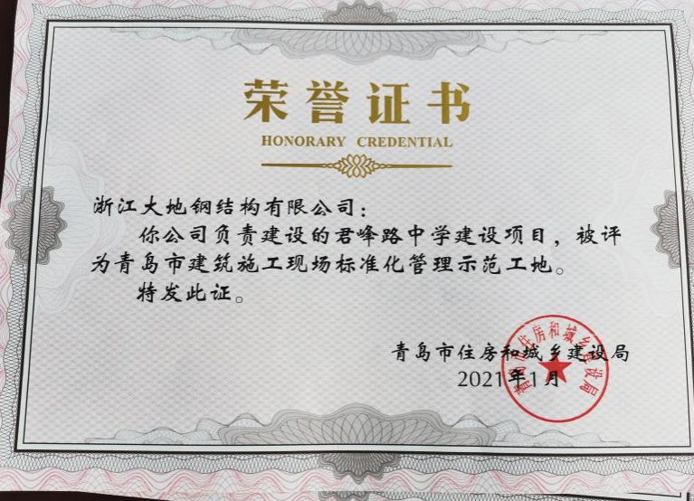 “标准化示范工地”的荣誉代表青岛市行业主管部门对我司项目施工总承包管理能力的认可,对我司开拓青岛市、山东省乃至全国建筑施工总承包市场有着积极的意义。青岛君峰路中学建设项目是我司进驻青岛市的第一个总承包项目,项目采用的全装配式钢结构形式,是青岛市业内第一例,加快了我司推广和实践装配式钢结构建筑的步伐。