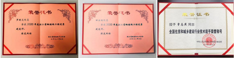 我司罗明文、田云雨荣获“2020年度浙江省钢结构工程优秀建造师”称号。曾志燕荣获全国住房和城乡建设行业技术能手荣誉称号。