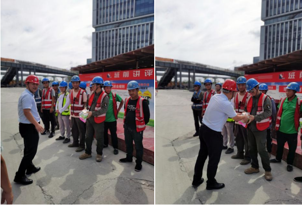 上海项目现场,副总经理王春峰一行来到建设者中间,向大家问好,并送上了毛巾、盐汽水、风油精等防暑降温用品。在交谈中,他要求项目部严格做好一线人员劳动保护和防暑降温工作,切实保障一线职工生命安全和身体健康。