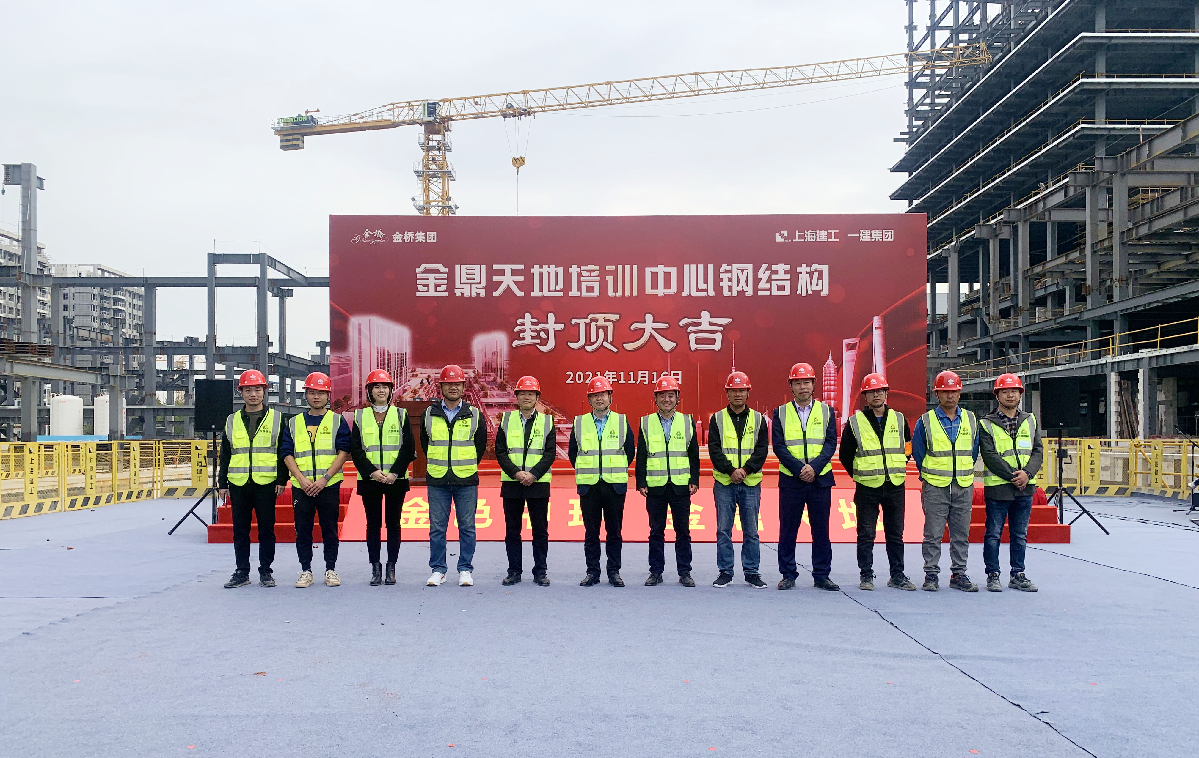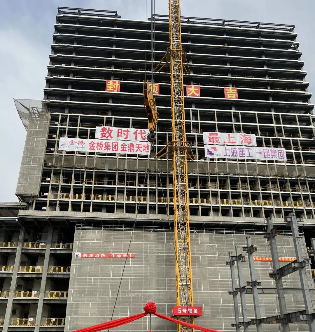 11月16日上午10:18,在上海浦东金鼎天地培训中心项目现场,在金桥管委会、业主、总包和公司领导的见证下,系挂着大红彩绸的钢梁缓缓升起,自5月份结构首吊以来,经过公司项目管理团队的齐心协作和辛苦拼搏,终于提前迎来了A幢塔楼框架钢梁顺利封顶的时刻。